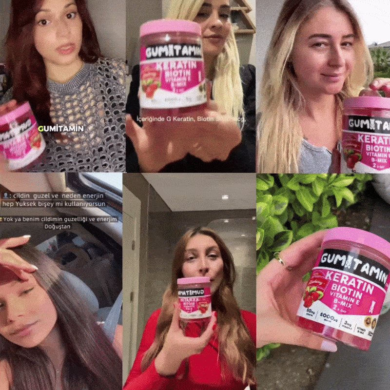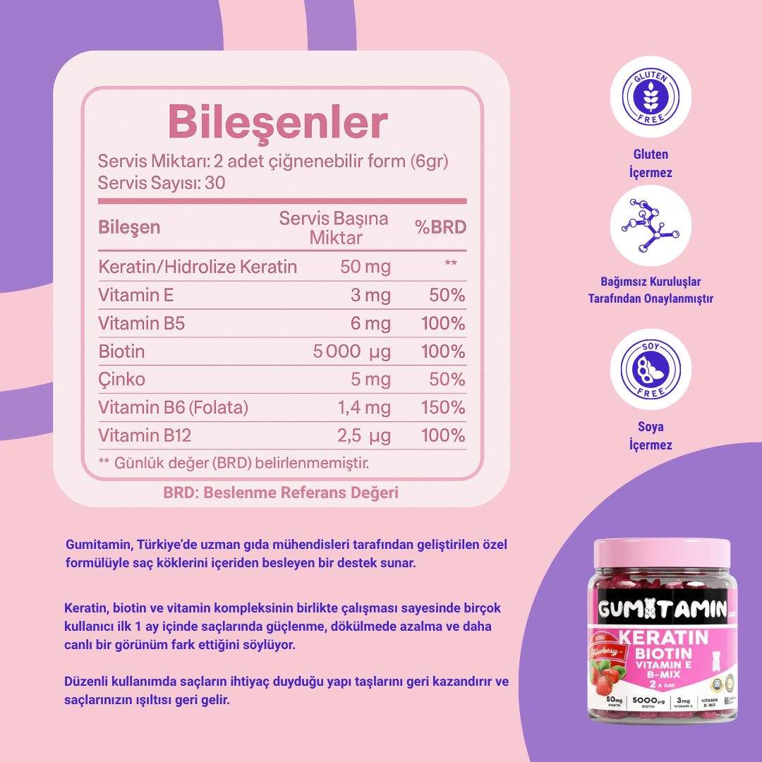 Çoğu biotin takviyesi tek içeriklidir. Gumitamin ise keratin + biotin + B vitaminleri + çinko kombinasyonunu aynı jelibonda sunar. Yani hem saç telinin yapısını güçlendirir hem de kökten beslenmeyi destekler. Bu da daha hızlı gözle görülür sonuç demektir.